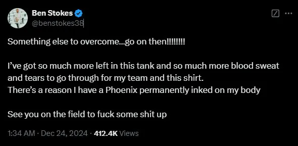 මේ අතර ආබාධත් සමඟ බෙන් ස්ටොක්ස්ට සිය නිල X ගිණුමට විශේෂ සටහනක් ද එක්කර තිබුණා.
