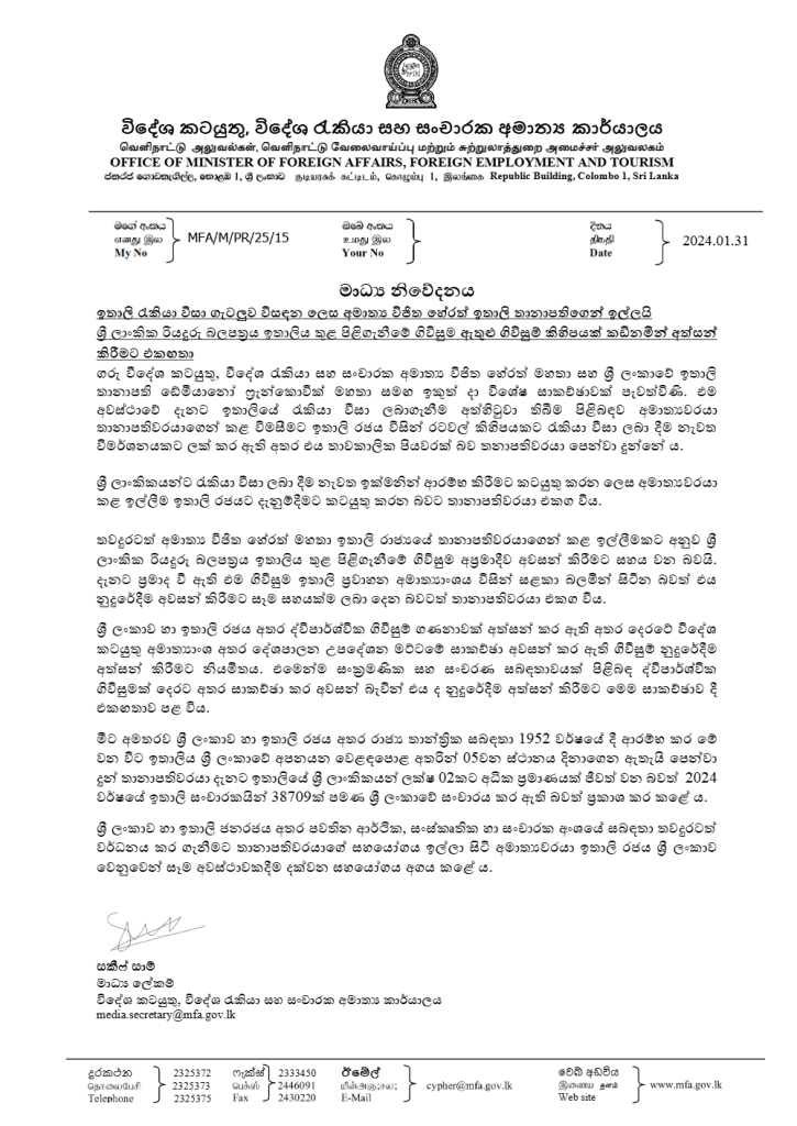 ශ්‍රී ලාංකිකයන්ට රැකියා වීසා ලබාදීම යළි කඩිනමින් ආරම්භ කරන ලෙසට අමාත්‍යවරයා කළ ඉල්ලීම ඉතාලි රජයට දැනුම් දීමට කටයුතු කරන බවට තානාපතිවරයා එහිදී එකඟ වූ බවයි වැඩිදුරටත් සඳහන් වෙන්නේ.
