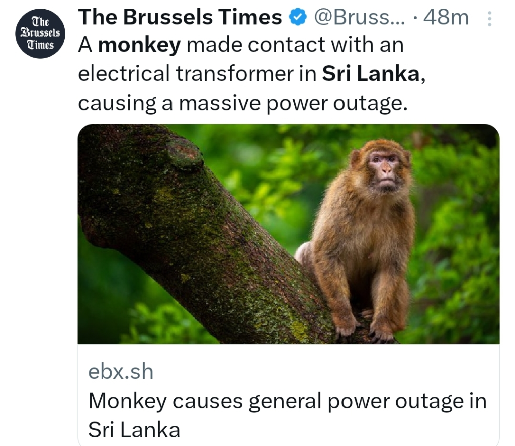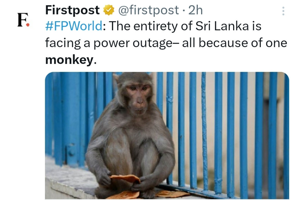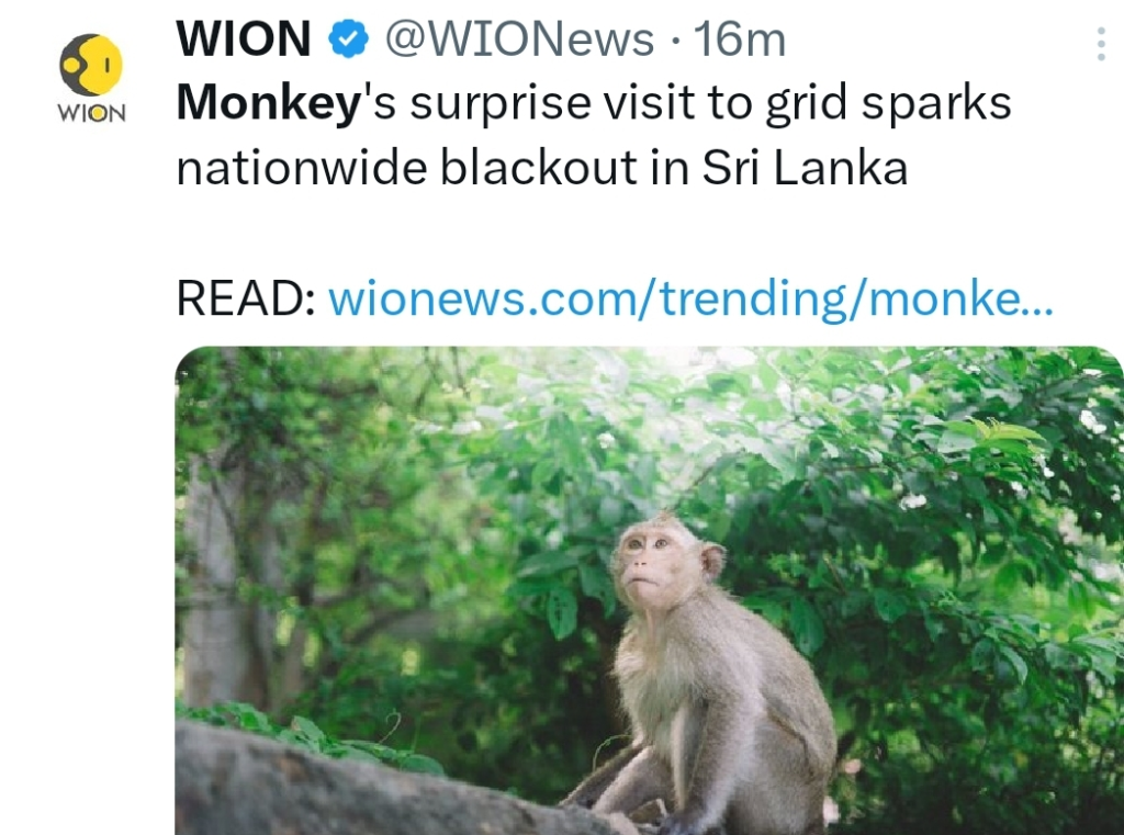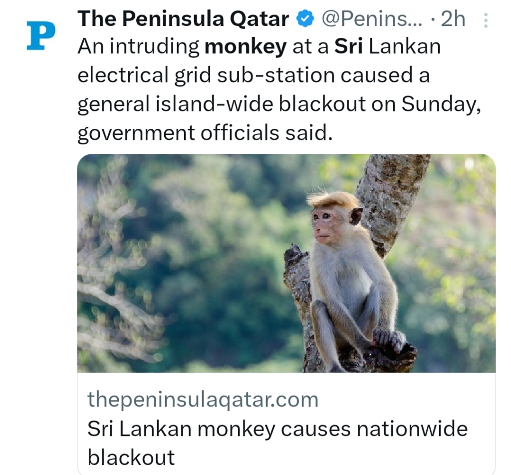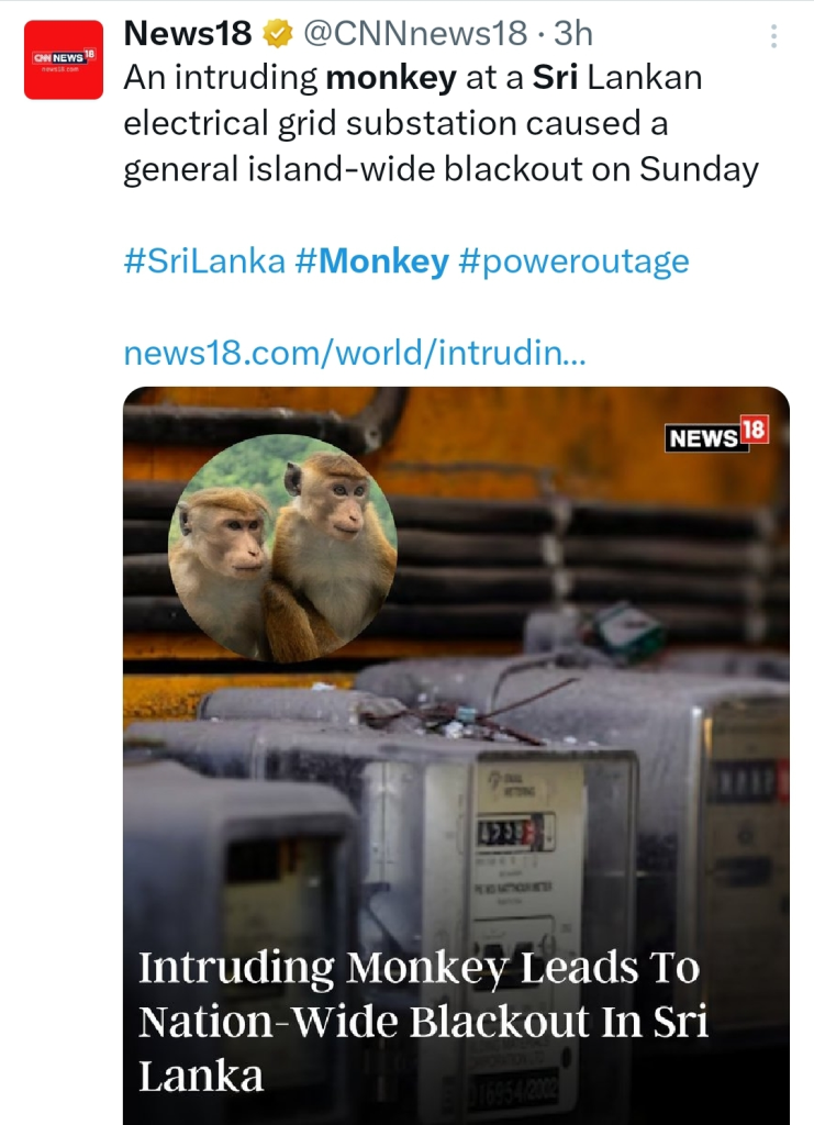 අනපේක්ෂිත ලෙස වඳුරෙකු විසින් ශ්රී ලංකාව පුරා විදුලිය විසන්ධි කිරීමක් සිදු කළ බවට ජාත්යන්තර මාධ්ය විසින් ප්රවෘත්ති පළ කර තිබෙනවා.