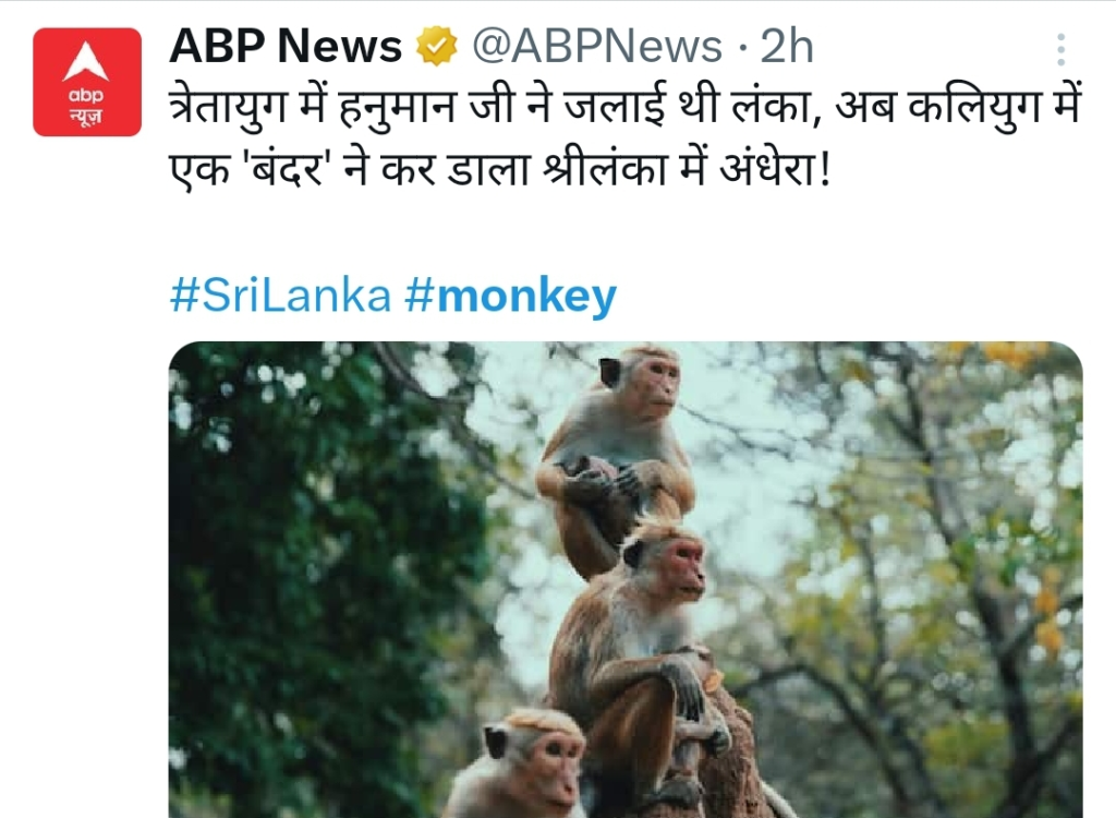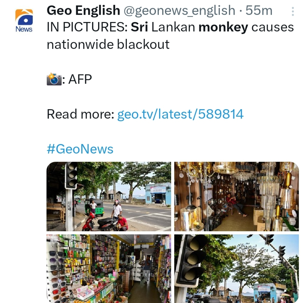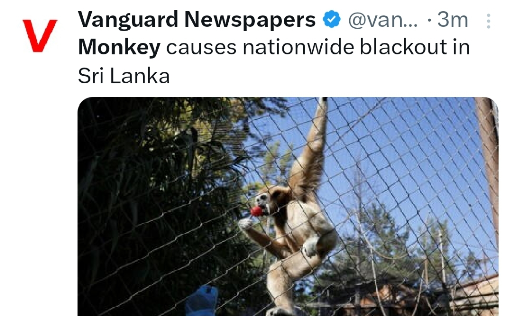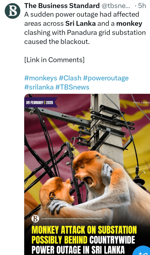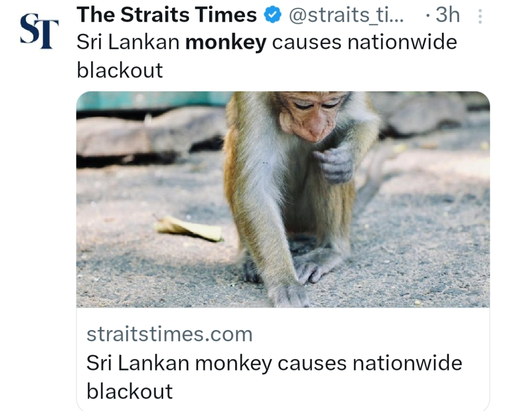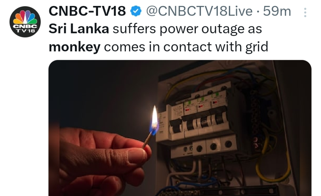 අනපේක්ෂිත ලෙස වඳුරෙකු විසින් ශ්රී ලංකාව පුරා විදුලිය විසන්ධි කිරීමක් සිදු කළ බවට ජාත්යන්තර මාධ්ය විසින් ප්රවෘත්ති පළ කර තිබෙනවා.
