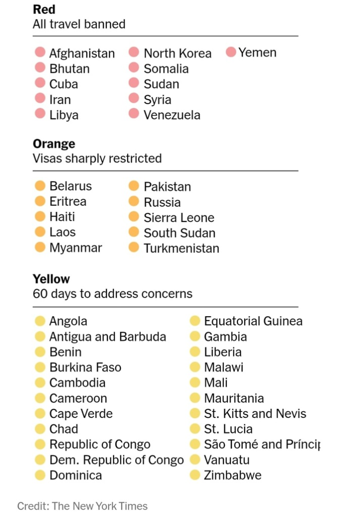 ඒ අනුව රාජ්‍ය තාන්ත්‍රික සහ ආරක්ෂක නිලධාරීන් විසින් සකස් කරන ලද නිර්දේශ කෙටුම්පත් ලැයිස්තුවක් මඟින් එක්සත් ජනපදයට ඇතුළුවීම සම්පූර්ණයෙන්ම තහනම් කරනු ලබන රටවල් 11 ක “රතු” ලැයිස්තුවක් යෝජනා කර තිබෙනවා.