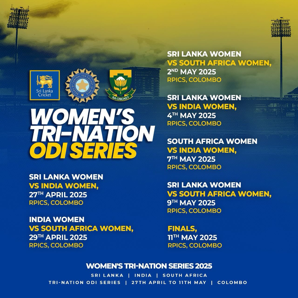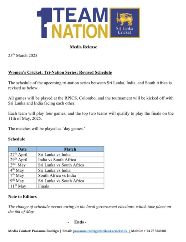 එළඹෙන අප්රේල් සහ මැයි මාසවලදී පැවැත්වීමට සැලසුම් කර තිබෙන කාන්තා තුන්කොන් ක්රිකට් තරගාවලියේ, තරග කාලසටහන සංශෝධනය කර තිබෙනවා.