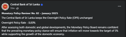 වත්මන් සහ අපේක්ෂිත දේශීය සහ ගෝලීය සාර්ව ආර්ථික ප්රවණතා පිළිබඳව මනාව සලකා බැලීමෙන් අනතුරුව මුදල් ප්රතිපත්ති මණ්ඩලය මෙම තීරණයට එළැඹි බව ශ්රී ලංකා මහ බැංකුව කියා සිටිනවා.