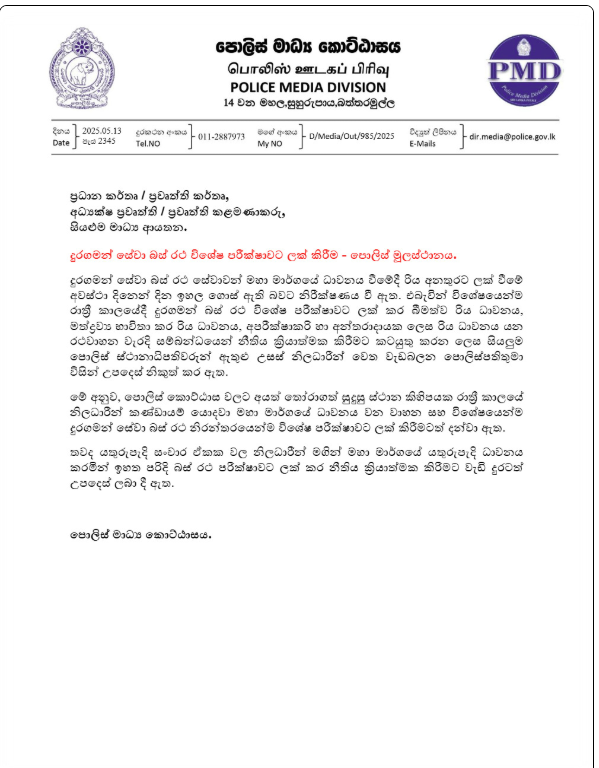 අනතුරු වැඩිවීම සැලකිල්ලට ගෙන රාත්රී කාලයේදී දුරගමන් බස් රථ විශේෂ පරික්ෂාවකට ලක් කිරීමට වැඩබලන පොලිස්පතිවරයා විසින් සියලුම පොලිස් ස්ථානාධිපතිවරුන් ඇතුළු උසස් පොලිස් නිලධාරීන් වෙත උපදෙස් ලබාදී තිබෙනවා.