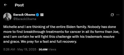 සිය නිල X ගිණුමෙහි සටහනක් තබමින් ඔබාමා පවසන්නේ, පිළිකා රෝගී තත්ත්වයන් සඳහා අවශ්ය කරන ප්රබල ප්රතිකාර සොයා ගැනීමට ජෝ තරම් කිසිවෙකු රට තුළ වැඩියමක් සිදු කර නොමැති බවයි.