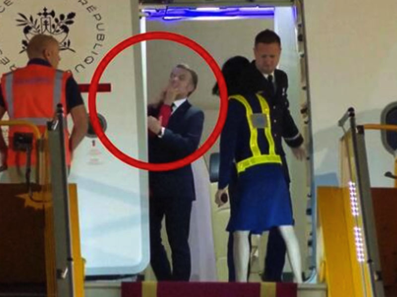 ජනාධිපතිවරයාගේ නිල ගුවන් යානයේ දොර විවර වූ පසු, කාන්තා අතක් තරවටු ස්වරූපයෙන් මැක්රොන්ගේ මුහුණ අල්ලා තල්ලු කරන ආකාරය දැකගත හැකියි.