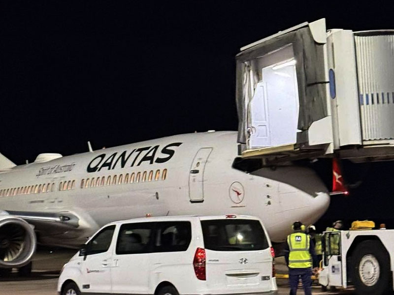 Qantas ගුවන් යානයක් ගුවන් පාලමක ගැටී තිබෙනවා.