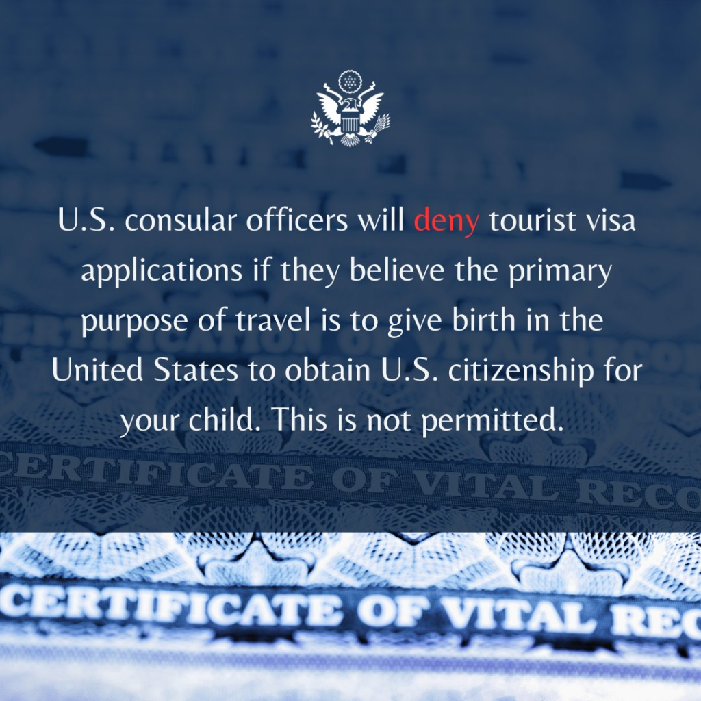 ඒ අනුව එම අනතුරු ඇඟවීමේ දක්වා ඇත්තේ, තම දරුවාට එක්සත් ජනපද පුරවැසිභාවය ලබාගැනීම සඳහා දරු ප්රසූතියක් කිරීමේ අරමුණින් සංචාරක වීසා මත එක්සත් ජනපදයට යන අයට අනාගතයේ වීසා ප්රතික්ෂේප වීමේ අවදානමක් ඇති බවයි.