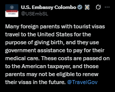 තානාපති කාර්යාලය සිය X ගිණුමේ පළකරන ලද පණිවිඩයක දැක්වෙන්නේ, එවැනි සංචාරකයන් බොහෝවිට එක්සත් ජනපද රජයෙන් අරමුදල් සපයන වෛද්ය ආධාර මත විශ්වාසය තබන බවත්, එමගින් අමෙරිකානු බදු ගෙවන්නන් මත මූල්යමය බර පැටවෙන බවයි.