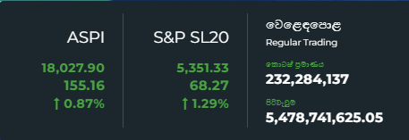 ඒ අනුව අද දිනයේ සියලු කොටස් මිල දර්ශක අගය ඒකක අගය සටහන් වන්නේ ඒකක 18,028.20ක් ලෙසයි.