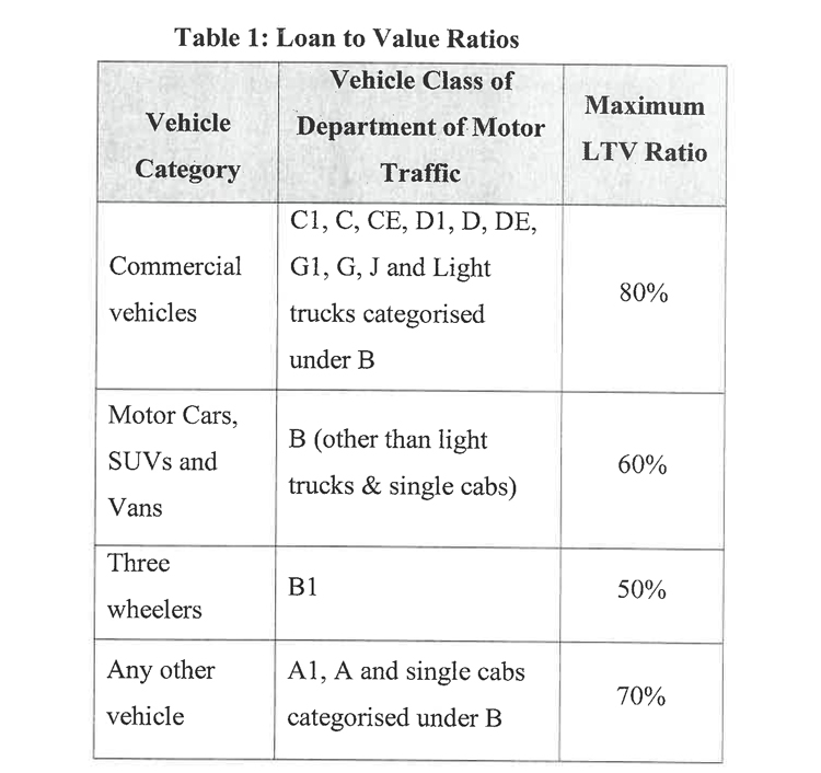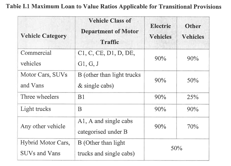 අනෙකුත් රථ සඳහා එහි වටිනාකම මෙන් 70% ක ණය සීමාවක් ලබාගත හැකි බව, ශ්රී ලංකා මහ බැංකුව නිවේදනය කරනවා.