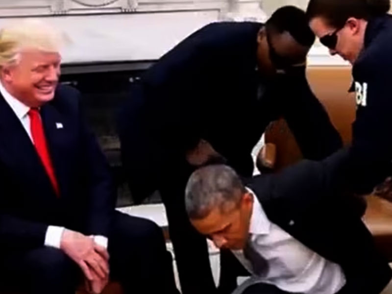 එක්සත් ජනපද ජනාධිපති ඩොනල්ඩ් ට්රම්ප් විසින් ඔහුගේ Truth Social සමාජ මාධ්ය ගිණුමේ පළ කරන ලද වීඩියෝවක හිටපු ජනාධිපති බැරැක් ඔබාමා ඕවල් කාර්යාලයේදී FBI විසින් අත්අඩංගුවට ගනු ලබන ආකාරය ව්යාජ ලෙස දැක්වෙනවා.