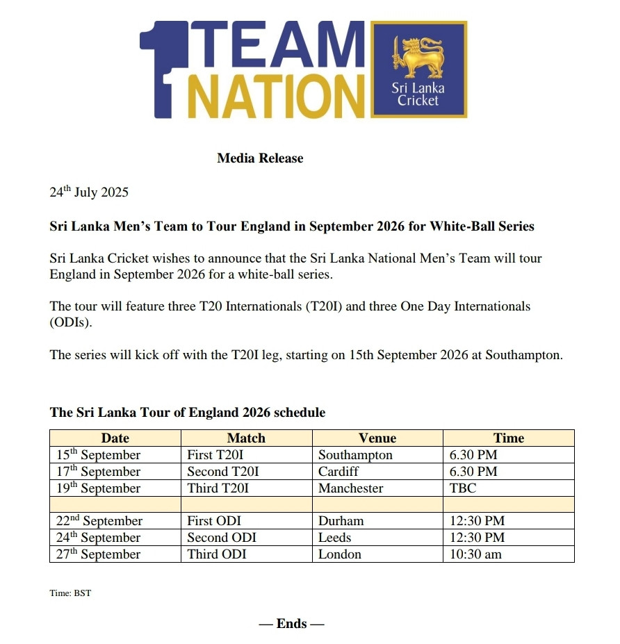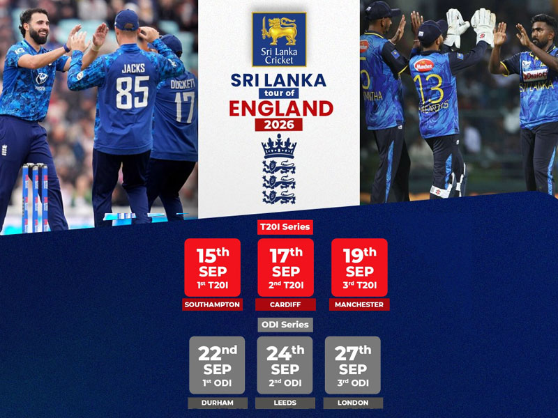ශ්රී ලංකා ක්රිකට් කණ්ඩායම 2026 වසරේ සැප්තැම්බර් මස සිදුකිරීමට නියමිත එංගලන්ත තරග සංචාරයේ තරග කාලසටහන නිවේදනය කර තිබෙනවා.