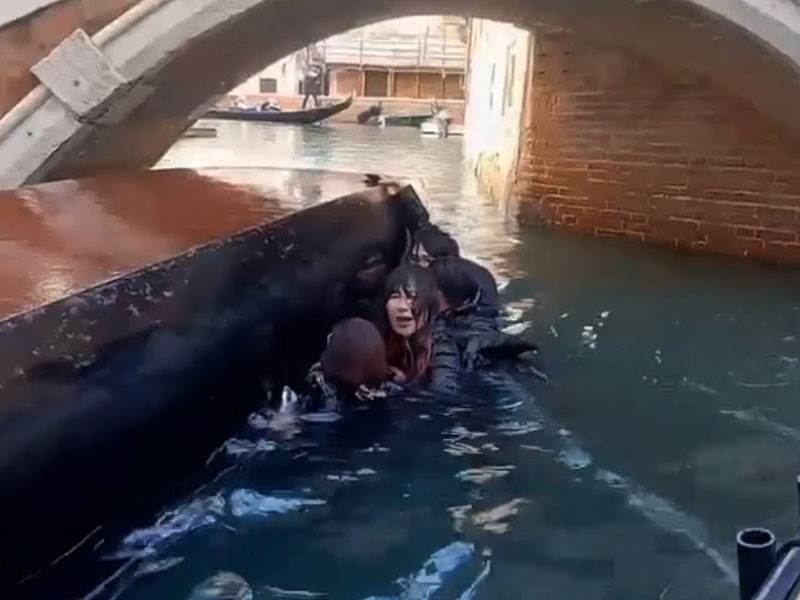 වැනීසියේ, ගොන්ඩෝලාවක ගමන් කරමින් සිටි සංචාරකයින් පිරිසක් හදිසියේම බෝට්ටුව පෙරළීමෙන් පසු ගොන්ඩෝලියර් සමඟ ඇළ මාර්ගයක ජලයට වැටී තිබෙනවා.