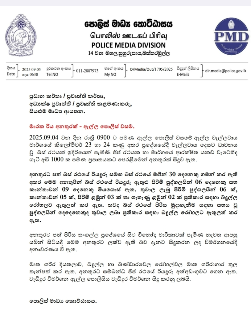 තංගල්ල නගර සභාවේ පිරිසක් රැගත් බස් රථයක් මෙලෙස අනතුරට ලක්ව ඇති බව තොරතුරු වාර්තා වුණේ.