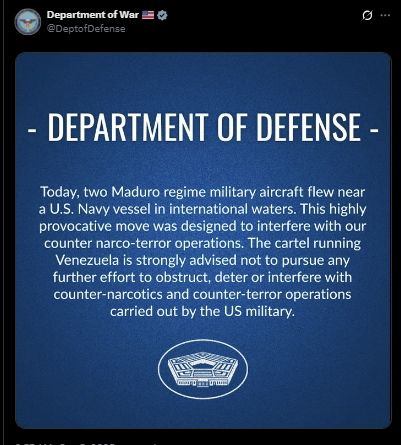 වොෂින්ටනය සහ වෙනිසියුලාව අතර උත්සන්න වන ගැටුම් මධ්යයේ, වෙනිසියුලානු F-16 ප්රහාරක ජෙට් යානා දෙකක් ජාත්යන්තර මුහුදේ එක්සත් ජනපද නාවික හමුදා නෞකාවක් අසලට පියාසර කිරීම ඉතා ප්රකෝපකාරී පියවරක් බව එක්සත් ජනපද ආරක්ෂක දෙපාර්තමේන්තුව නිවේදනය කර තිබෙනවා.