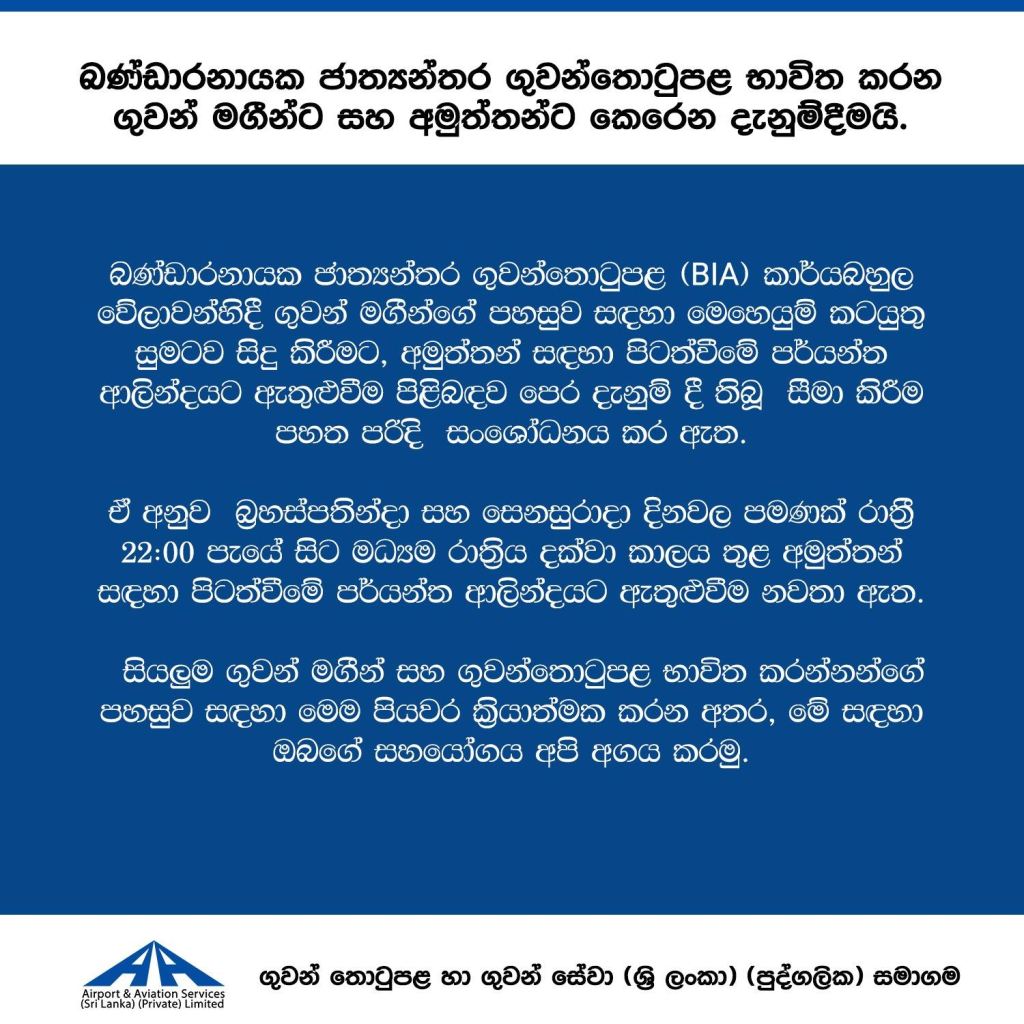 මෙම සීමා පැනවූ කාලය තුළ සියලුම මගීන්ගේ පහසුව තහවුරු කිරීම සඳහා මගීන්ගෙන් සහ මහජනතාවගෙන් සහයෝගය ඉල්ලා සිටින බව ගුවන්තොටුපළ අධිකාරිය වැඩිදුරටත් සඳහන් කරනවා.