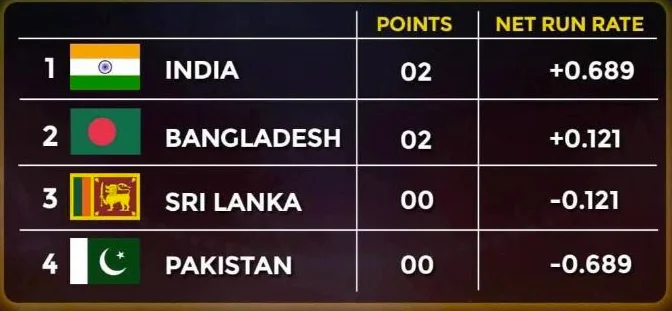 ආසියානු කුසලාන ක්රිකට් තරගාවලියේ සුපිරි හතරදෙනාගේ වටයේ ප්රසාද ලකුණු සටහනේ පෙරමුණ ගැනීමට ප්රසාද ලකුණු 2 ක් හා 0.689 ක දල ශුද්ධ ලකුණු වේගයක් වාර්තා කරගත් ඉන්දීය කණ්ඩායම සමත්ව තිබෙනවා.