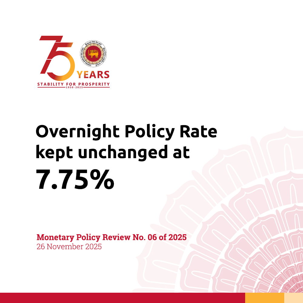 ඒ අනුව ශ්රී ලංකා මහ බැංකුවේ එක්දින ප්රතිපත්ති පොලී අනුපාතිකය (OPR) සියයට 7.75 මට්ටමේම නොවෙනස්ව පවතියි.