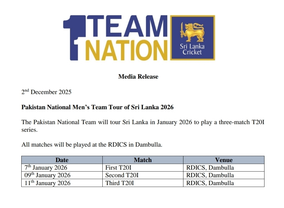 පාකිස්තාන කණ්ඩායම එළඹෙන ජනවාරියේ ශ්රී ලංකාවේ තරග සංචාරයක් සඳහා එක්වීමට නියමිතයි.