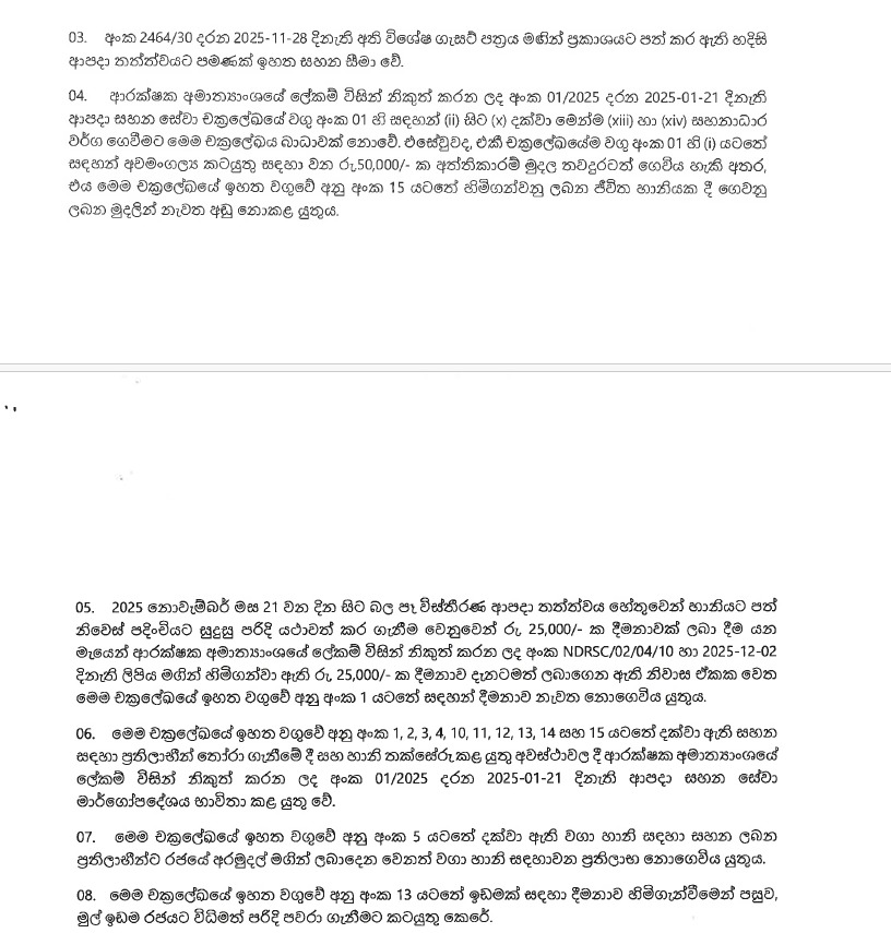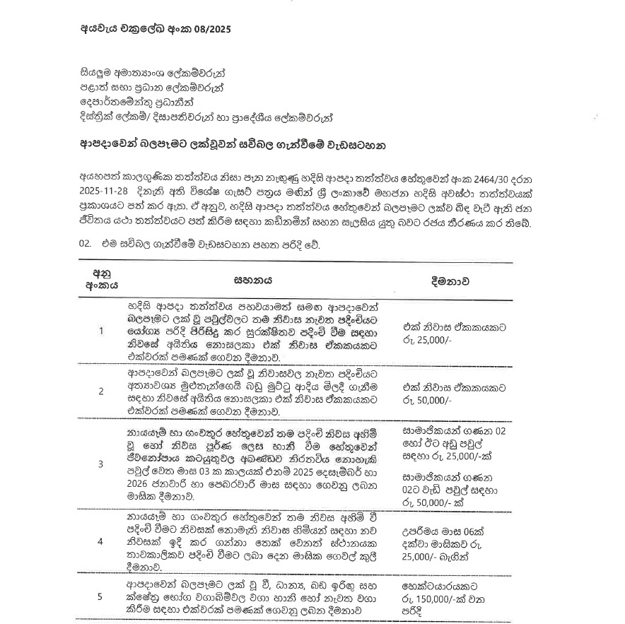 ශ්‍රී ලංකාවේ ආපදා සහන ලබාදීමට අදාළ විශේෂ චක්‍රලේඛය නිකුත් කර තිබේ.