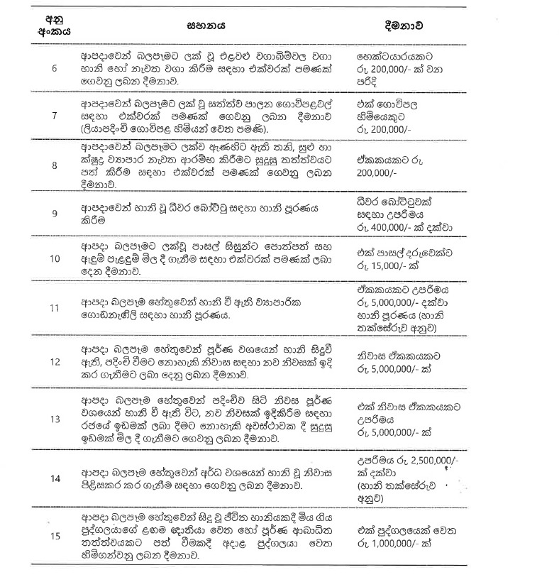ආපදා බලපෑම හේතුවෙන් හානිවී ඇති ව්‍යාපාර ගොඩනැගිලි සඳහා රුපියල් පනස් ලක්ෂයක් දක්වා හානි පූර්ණ වන්දියක් ගෙවීමට නව චක්‍රලේඛය මගින් ප්‍රතිපාදන සැලසෙයි.