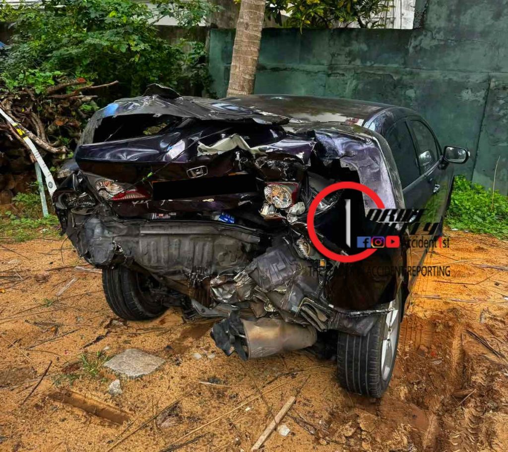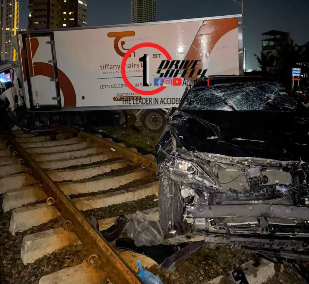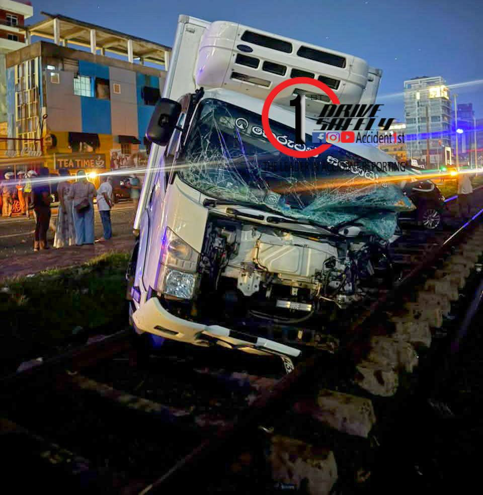 මෝටර් රථ දෙකේ ගැටුණු ලොරි රථය පසුව දුම්රිය මාර්ගය දෙසට ධාවනය වී දුම්රිය පීලි මත නතර වී තිබේ.