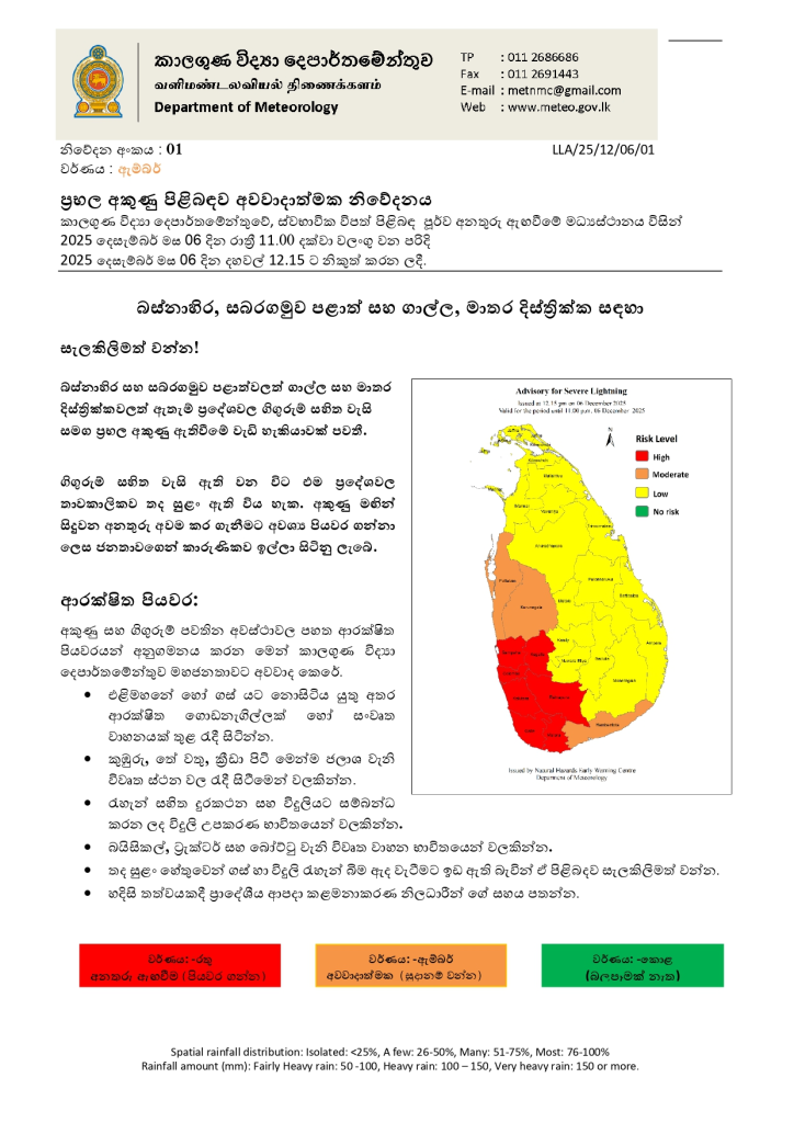 ප්‍රබල අකුණු පිළිබඳව අවවාදාත්මක නිවේදනයක් කාලගුණ විද්‍යා දෙපාර්තමේන්තු විසින් නිකුත් කර තිබේ.