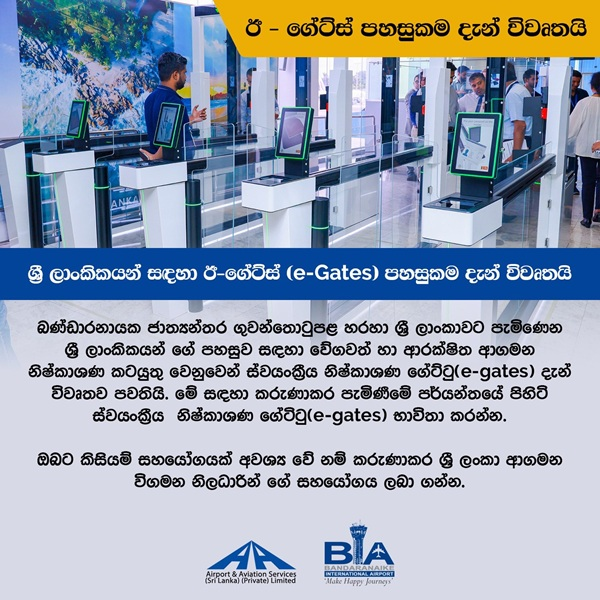 කටුනායක බණ්ඩාරනායක ජාත්යන්තර ගුවන්තොටුපළේ ස්වයංක්රීය ඊ-ගේට්ටු හඳුන්වා දී ඇති අතර එමඟින් ශ්රී ලාංකික මගීන්ට ඉක්මන් හා ආරක්ෂිත ආගමන නිෂ්කාශනයක් ලබා ගත හැකිය.