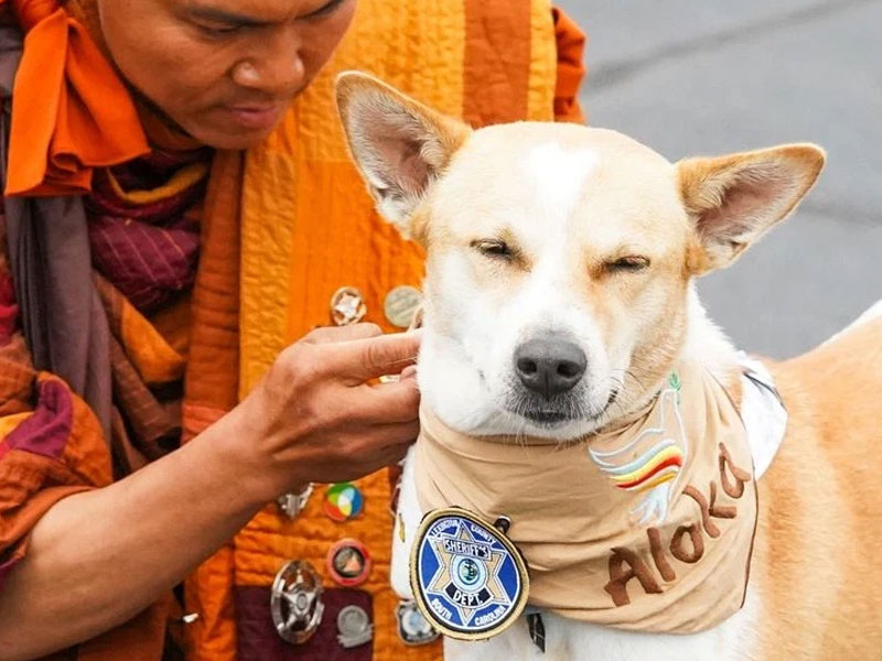 ඉන්දියාවේ වීදියක අසරණව සිටි සුනඛයෙකු වූ ආලෝක මීට පෙර මෙම භික්ෂූන් වහන්සේලා සිදුකළ දීර්ඝ පාගමනකදී හමුවී උන්වහන්සේලා සමඟම සිටියා.