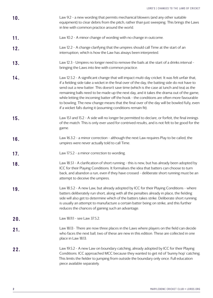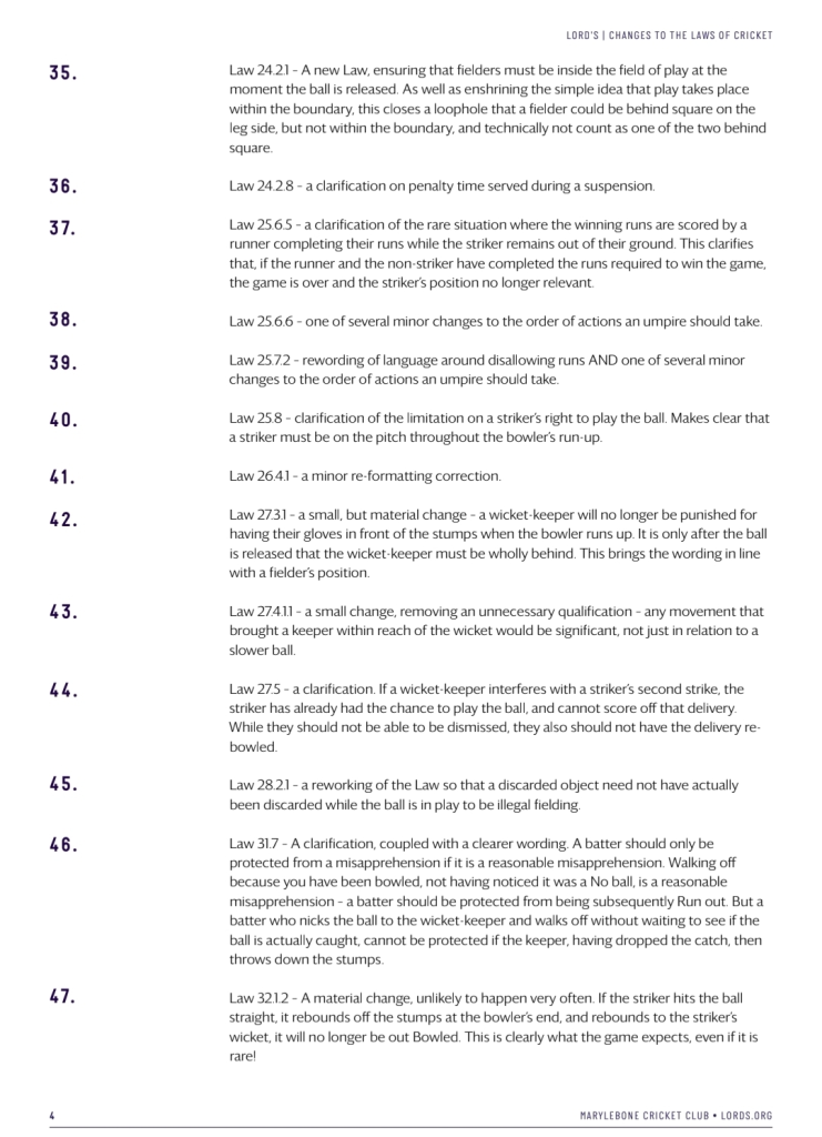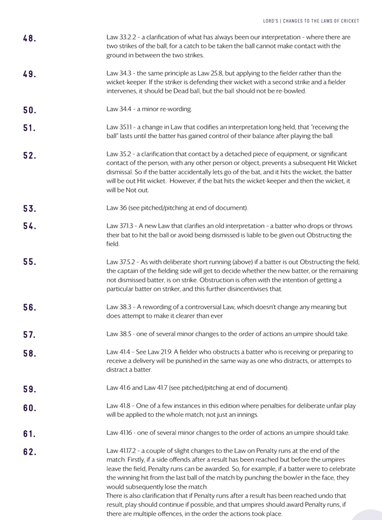 එමෙන්ම මෙතෙක් පැවති සංකීර්ණ ඕවර් ත්රෝ නීතිය සරල කර ඇති අතර, ‘ඕවර් ත්රෝ’ එකක් සහ ‘මිස්ෆීල්ඩ්’ (පන්දු රැකීමේදී සිදුවන අතපසුවීමක්) යනු කුමක්ද යන්න වඩාත් පැහැදිලිව අර්ථ දක්වා තිබේ.