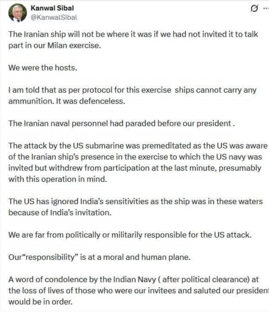 ඉන්දියාවේ ආරාධනය අනුව යුද අභ්‍යාසයකට සහභාගී වීමට පැමිණ ඉන්දීය ජනාධිපතිවරියට ආචාර කළ ඉරාන නෞකාවේ සිටි නාවිකයින්ගේ මරණ සම්බන්ධයෙන් ශෝකය ප්‍රකාශ කිරීම ඉන්දීය නාවික හමුදාවට යම් වගකීමක් ඇති කරුණක් බව ඉන්දියාවේ හිටපු විදෙස් කටයුතු ලේකම් කන්වාල් සිබාල් මහතා සඳහන් කරයි.