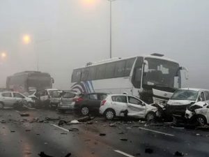 ඉන්දියාවේ අධිවේගී මාර්ගයකදී බස් රථ 10ක් එකට ගැටෙයි